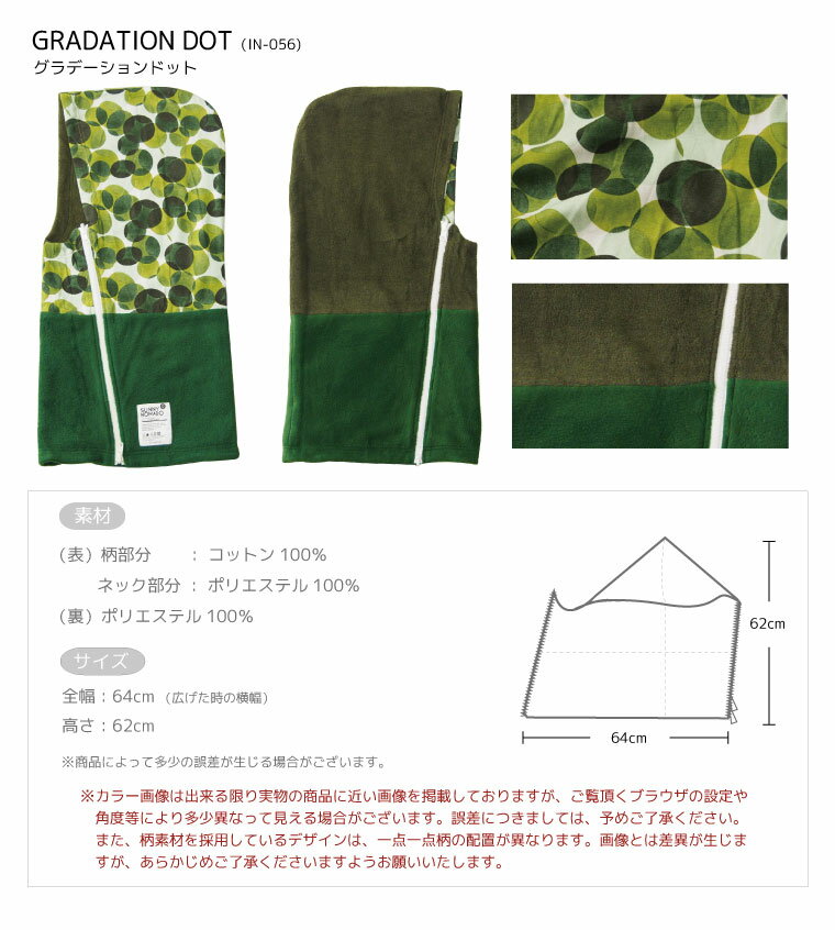 素材(裏表)ポリエステル100%(柄部分コットン100%) カラーグラデーションドット(IN-056) サイズ(cm) 【FREE】64×62cm 大人気カバーソックスはコチラSTAFF COMMENT 【HOT-KAMURI】ホッカムリとはNOMADOよりリリースされた新感覚のウォームウェアです!暖かなフリース素材で、 頬をかくすように、頭から首までを優しく覆う、新しいネックウォーマーです。